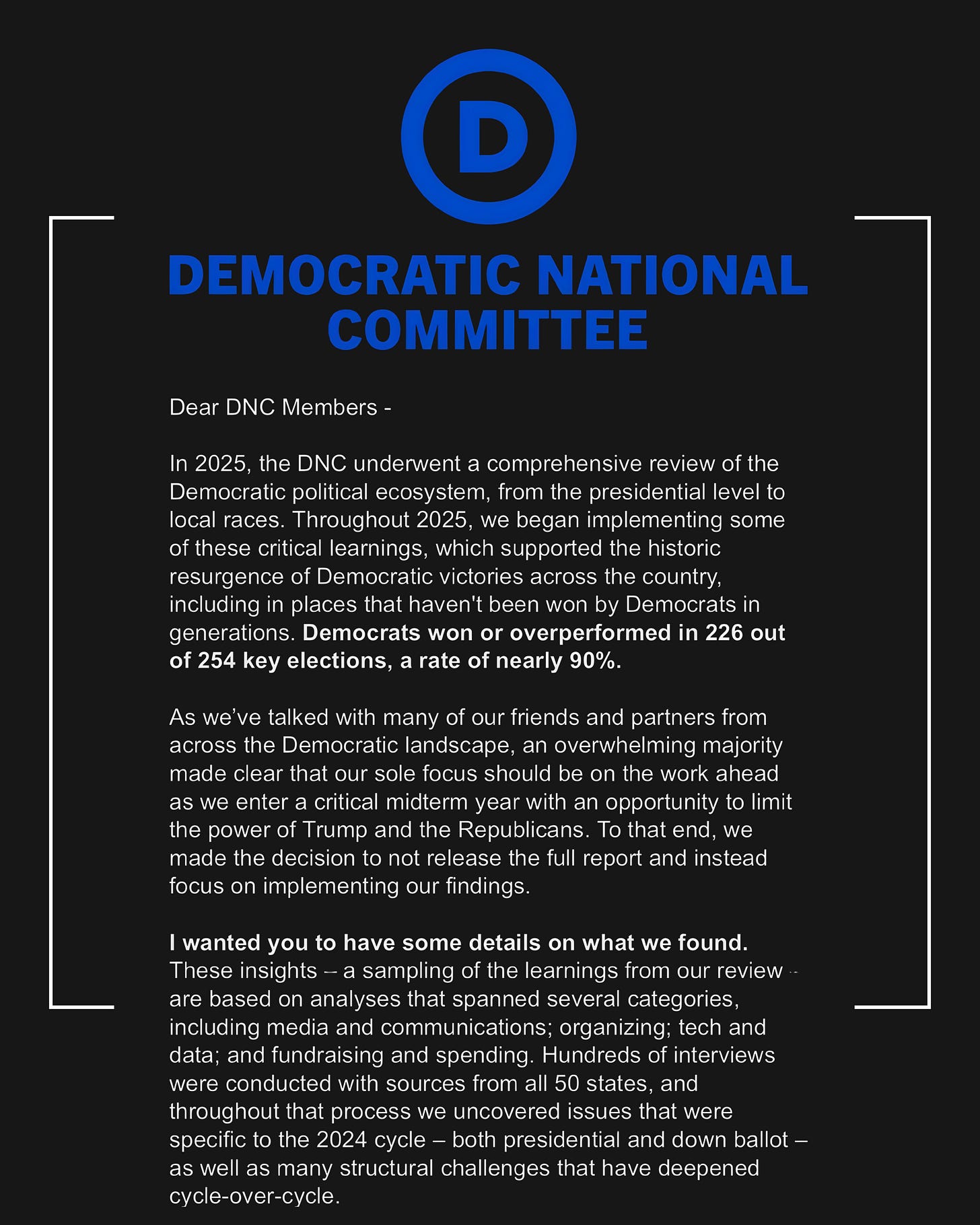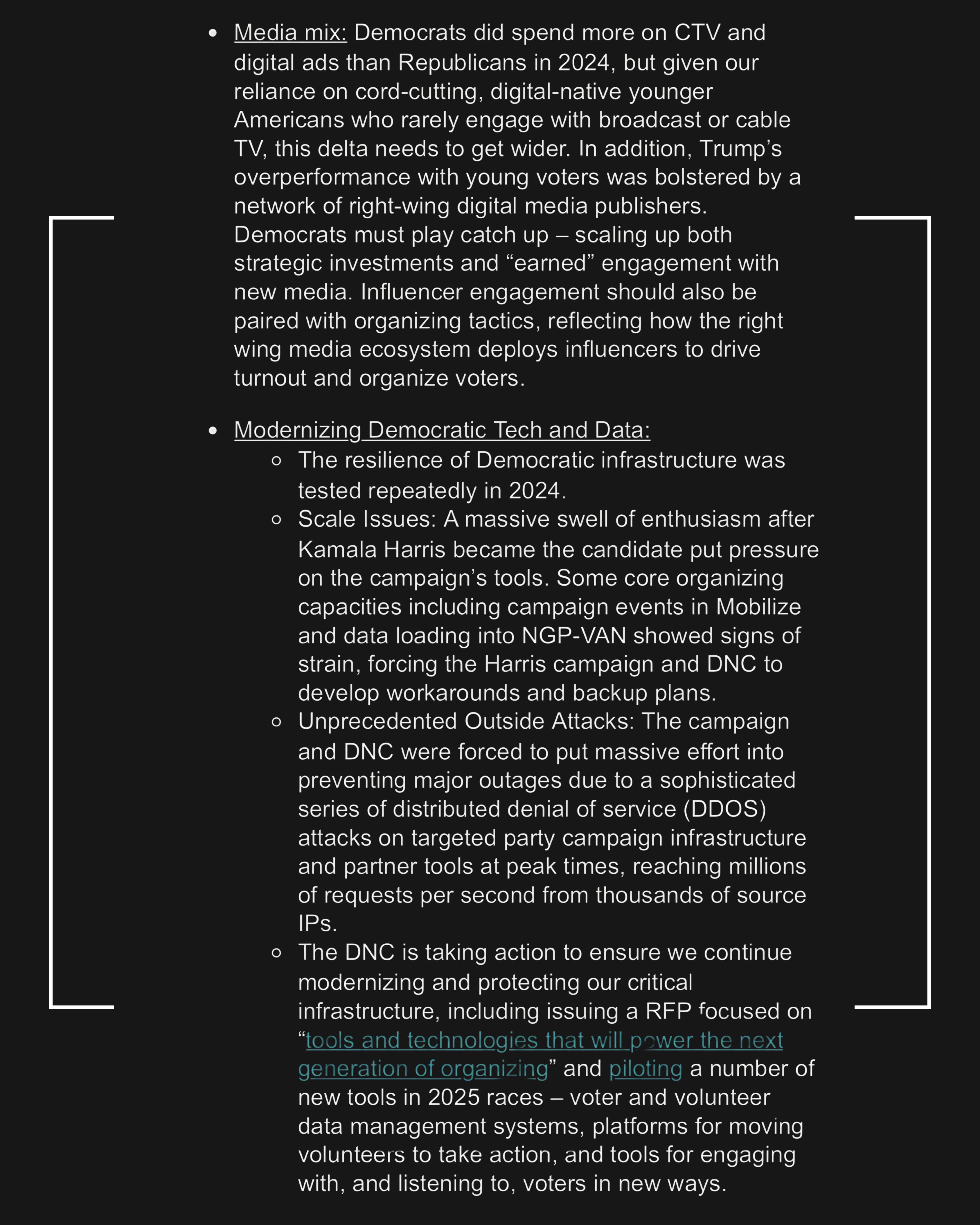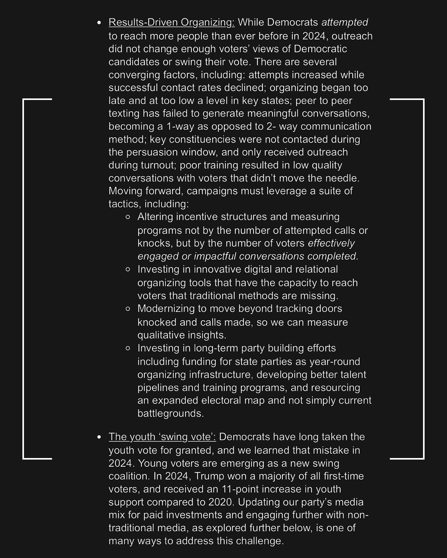 And those “lessons learned” bullets land the way they do because they read like internal performance notes, not a public accounting. Media mix. Tech and data. Results-driven organizing. Youth vote. Some of it is obvious. Some of it is overdue. Some of it is the kind of stuff organizers have been screaming for years… But the point isn’t whether the bullets are right.