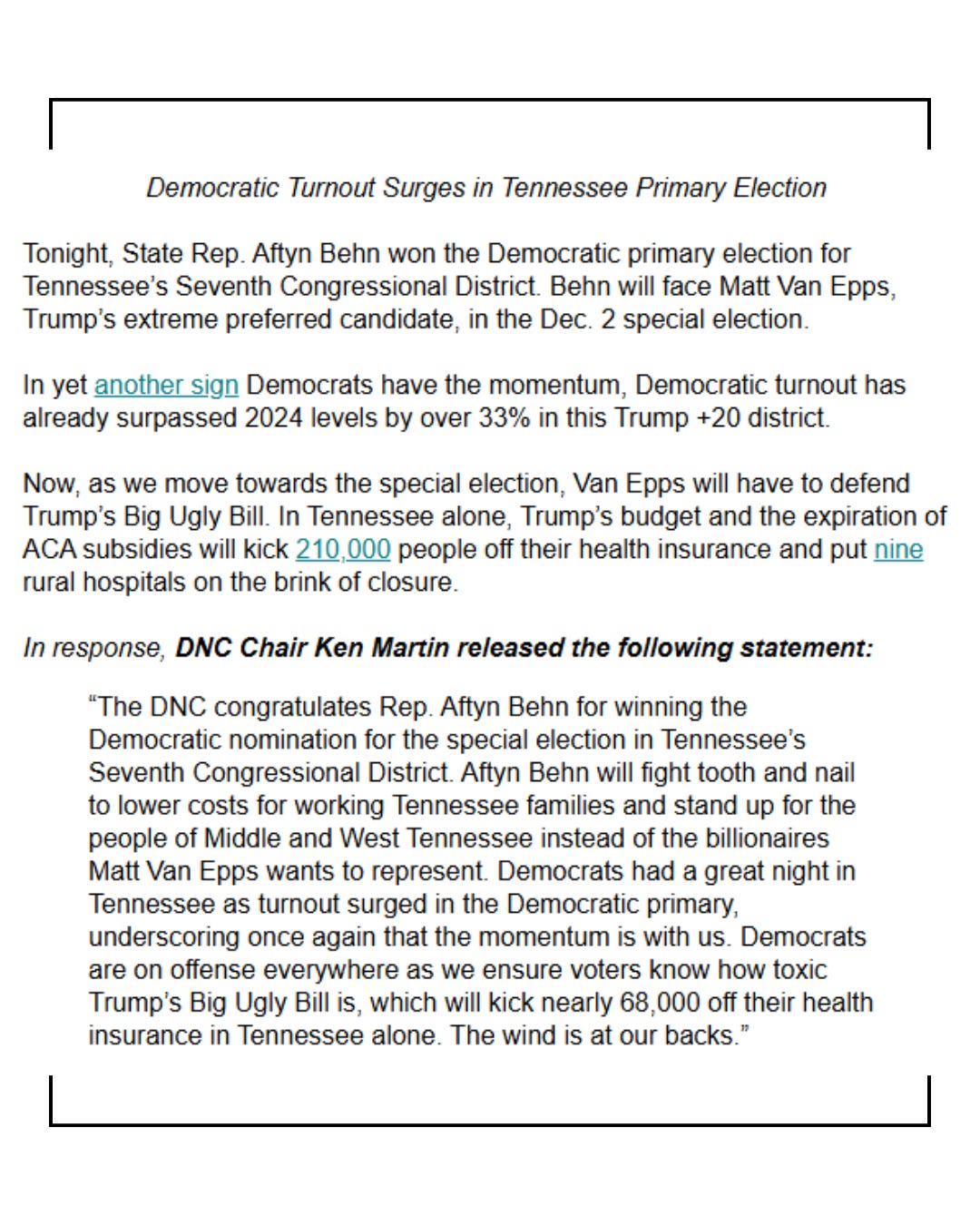 “For too long,” she said, “Tennessee Democrats have been told to moderate more, spend more, and hope for the best. But if that playbook worked, we’d already have a blue state.”